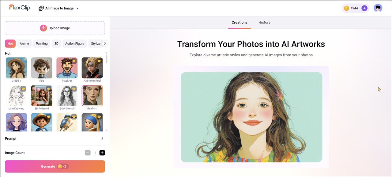 FlexClip’s AI Image to Image feature is designed to transform existing photos or graphics into new visual styles using AI.