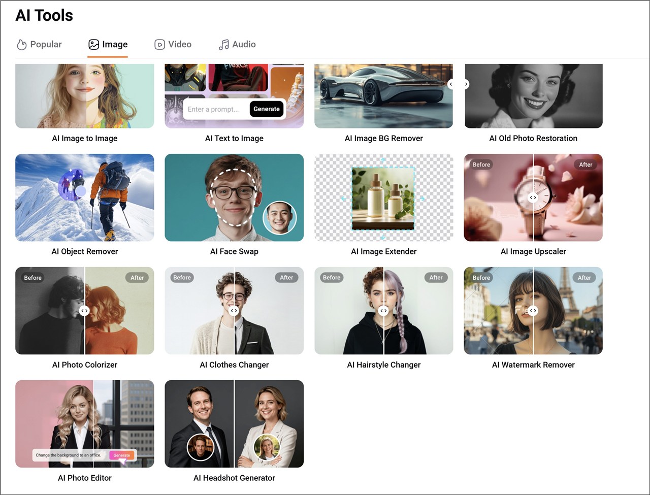 Just some of the popular options include AI video generator, ai image to image, ai text to image, ai text to speech, ai voice cloning, ai music generator, and ai auto subtitle.