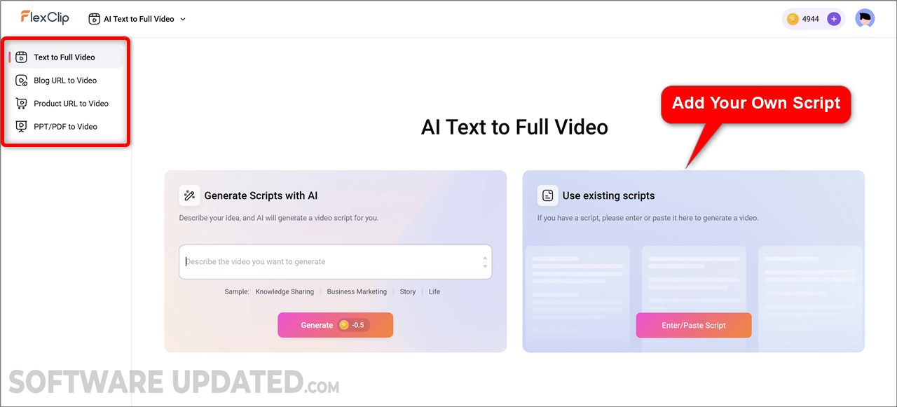 Flexclip now also has an AI text to FULL video generator. You can either generate a script with their AI, or add your own script. The AI will use stock video and images to create your video.