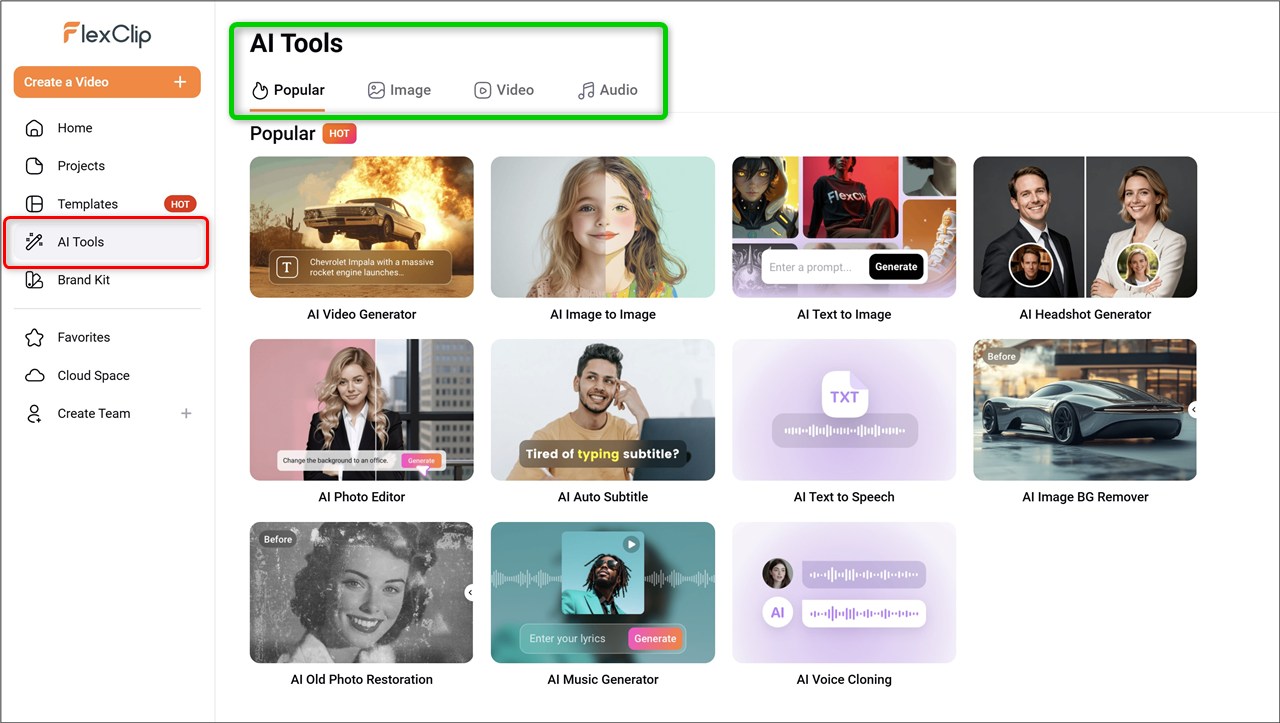 The AI tools section is the central hub for FlexClip’s generative features. I found the panel uncluttered and clearly labeled.