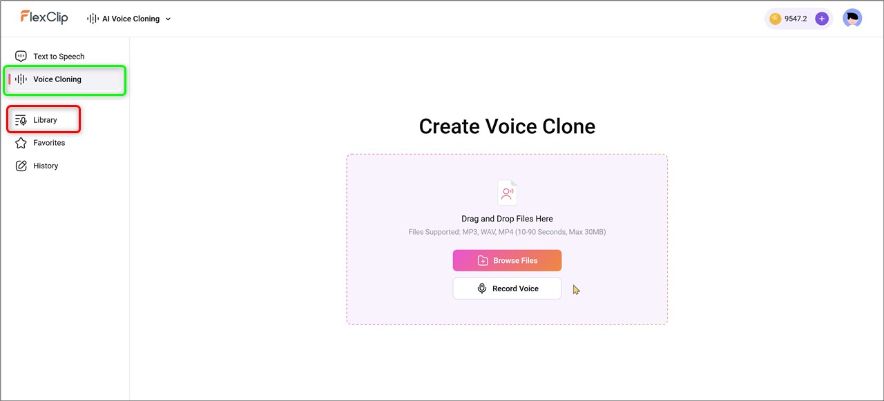 The setup is straightforward: you record or upload a short voice sample, FlexClip processes it, and then you can generate spoken audio simply by typing text.