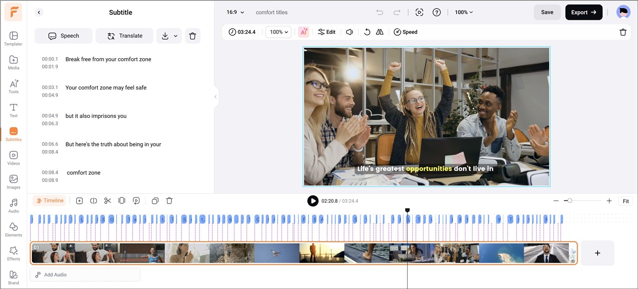 The interface is straightforward: upload a video, click to generate the transcript, and the subtitles appear in a timeline where they can be adjusted. For most clear audio recordings, the accuracy is impressive and dramatically faster than typing captions manually.