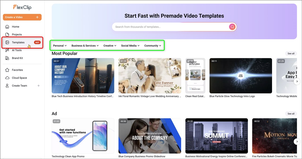 A major productivity boost in FlexClip comes from the template and stock media libraries. With thousands of customizable templates, you can create a social media ad, a YouTube intro, or a product promo in minutes.