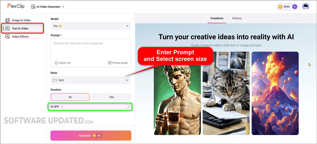 To animate an image, upload a photo or use a generated image from FlexClip. Then describe the action you want in the prompt box.